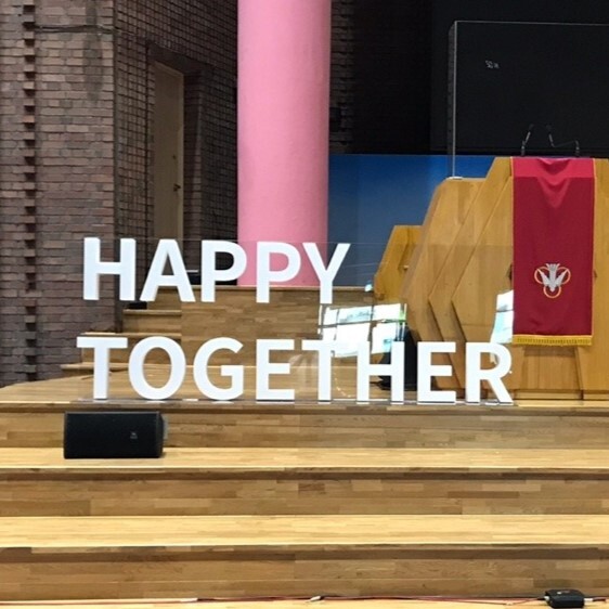 능곡 교회 예배당 무대 위에 교회 슬로건인 ‘ HAPPY TOGETHER ’를 활용한 입식형 글자 조형물이 설치되었습니다.