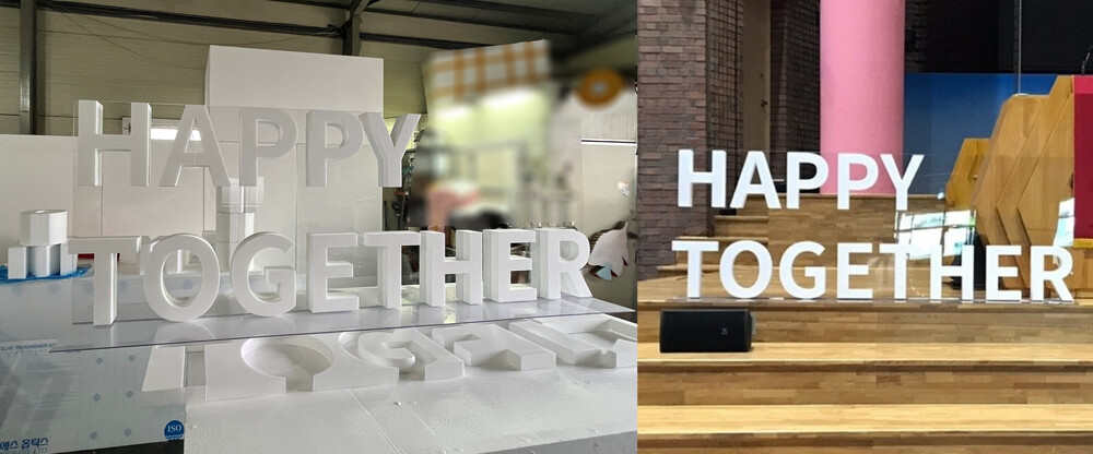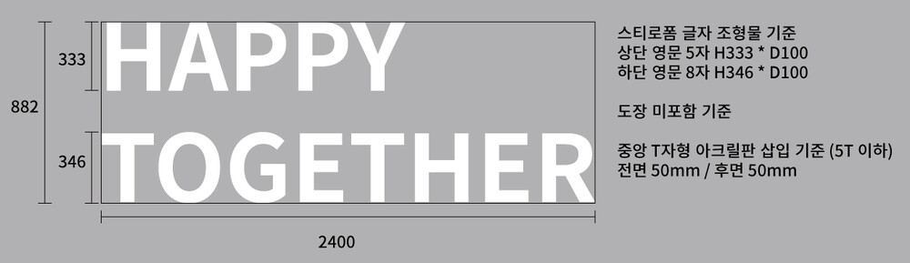 능곡 교회의 슬로건인 ‘ HAPPY TOGETHER ’를 2단 구성으로 배치한 후, 글자 크기와 간격을 고려하여 전체 가로 2400mm으로 대형 스티로폼 글자 조형물 디자인 시안 제작이 진행되었습니다. 상단 5자는 H333mm, 하단 8자는 H346mm로 제작이 계획되었으며, 글자 조형물의 안정성을 위해 중앙에 T자형 아크릴 지지대를 삽입하였습니다. 현장 무대 비율과 시인성을 고려해, 설치 후 이질감 없이 자연스럽게 어우러지도록 디자인 시안이 제작되었습니다.
