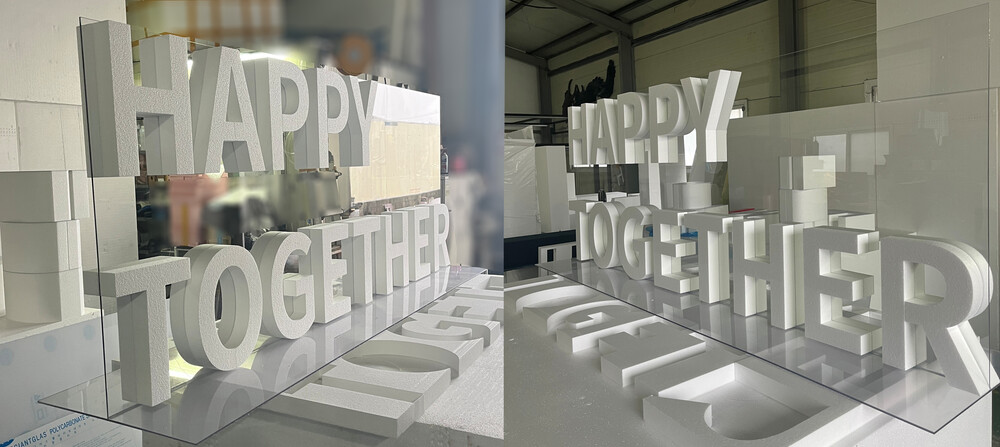 디자인 시안이 확정된 후에는 컴퓨터 재단기를 활용하여 각 글자의 높이와 두께에 맞춰 스티로폼을 정밀하게 재단하였습니다. 스티로폼 글자 조형물 재단 시에는 영문 기준으로 글자 높이 최소 80mm, 두께는 최소 15mm 이상으로 제작되어야 합니다. 이보다 작을 경우에는 O의 경우와 같은 막혀 있는 글자는 재단기 열로 인해 녹아 글자의 형상이 제대로 구현되지 못할 수도 있습니다. 이를 방지하기 위해 적정 크기를 유지한 상태에서 안정적인 입체 글자를 재단 진행하였습니다.