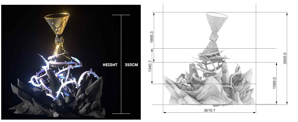 저희 헤파이스토스웍스는 3M 이상의 대형 조형물을 자체적으로 설계, 제작, 설치가 가능한 몇 안 되는 전문 제작 업체입니다. 이번 발로란트 트로피의 경우에는 클라이언트께서 제공해 주신 3D 디자인 시안을 토대로 제작 가능성, 안정성 등을 검토 후 최적의 제작 방식과 설치 작업을 안내해 드렸습니다.