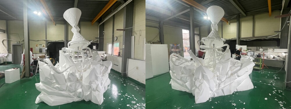 이번 행사 조형물은 대형 사이즈이기 때문에 안정성을 고려하여 하단부 바닥, 덩굴, 트로피 각 개별 파트로 나누어 원형 조각을 진행해 주었습니다. 트로피 조형물은 디테일한 부분들이 많기 때문에 일반 스티로폼 소재가 아닌 밀도가 높고 입자가 단단한 조각용 스티로폼을 사용하여 작업을 진행해 주었습니다. 원형 조각 중앙에는 얇은 필름지를 추가하여 몰드 제작시 원활하게 분리가 될 수 있도록 작업해 주었습니다.
