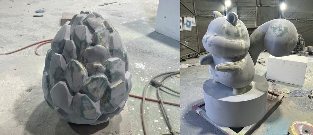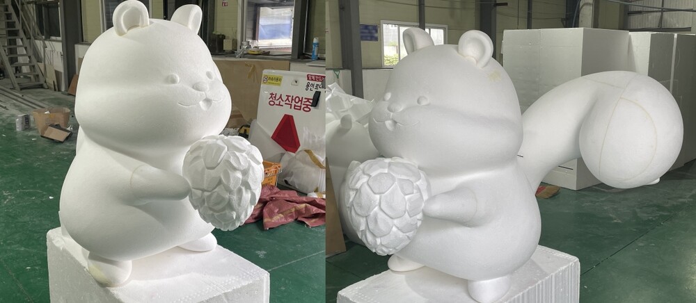 원형 조각이 완료된 강릉앤솔 조형물은 규산을 도포해 주었습니다. 규산이 건조가 되면 몰드를 제작해 주는데요. 이때 꼬리, 솔방울 부분은 깔끔하게 제작해 주기 위해 분할하여 제작을 진행해 주었습니다. 제작이 완료된 다람쥐 조형물 몰드 내부를 다듬고 FRP를 적층하여 성형체 제작을 진행해 주었습니다. 제작 후 분할하여 제작된 부분들을 디자인 시안과 동일한 위치에 결합 시켜 준 뒤 도색 작업을 위해 프라이머를 도포해 주었습니다.
