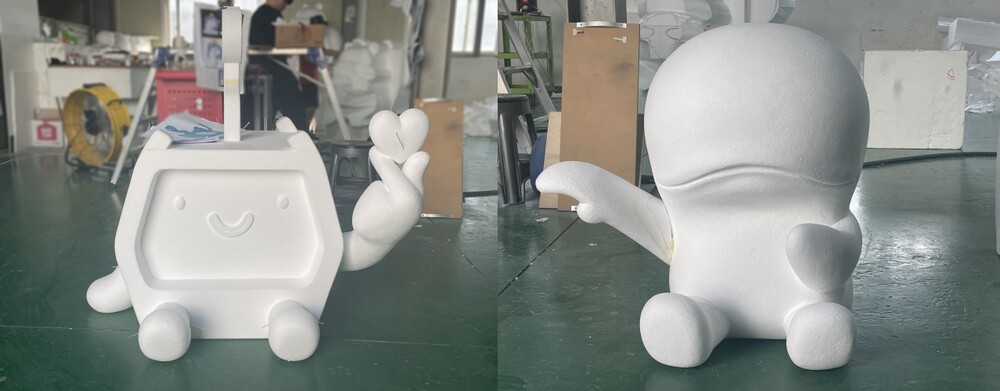디자인 시안이 확정된 마스코트 조형물은 조형물 제작을 본격적으로 진행해 주었습니다. 조형물 제작 첫 번째 단계는 원형 조각으로 조각용 스티로폼을 사용하여 제작해 주었습니다. 원형 조각은 사람의 손으로 제작이 되는 만큼 FRP 조형물의 손 하트, 머리 부분, 꼬리 등 디테일한 부분들까지 제작이 가능합니다. 원형 조각이 완료되면 규산을 도포해 주었습니다.