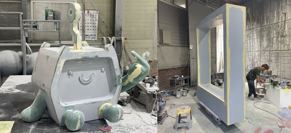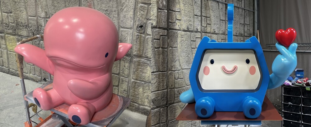 규산이 건조된 마스코트 조형물은 하트, 꼬리, 머리 등의 부분들은 정교한 제작을 위해 분할하여 몰드 제작을 진행해 주었습니다. 제작된 몰드 내부를 다듬고 성형체 적층을 진해해 주었습니다. 성형체 적층 후 분할하여 제작된 부분들은 디자인 시안과 동일한 위치에 부착해 주었습니다. 이렇게 마스코트 FRP 조형물이 제작되는 동안 포토존 프레임 형태의 금속 조형물은 갈바 소재를 사용하여 제작해 주었습니다.