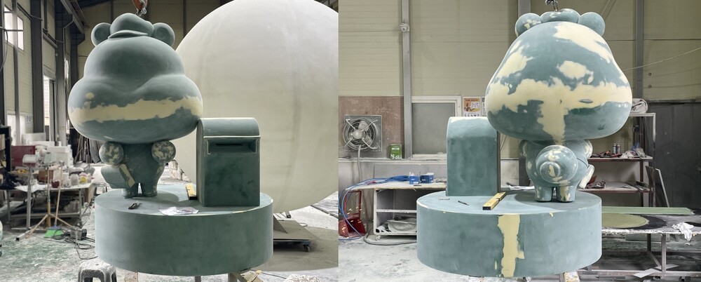 연마 작업이 완료된 캐릭터 조형물은 프라이머를 도포해 준 뒤 프라이머가 다 건조가 되면 도색 작업을 진행해 주었습니다. 도색 작업은 넓은 부위 밝은 색상부터 좁은 부위 어두운 색상 순으로 분사식 도장 방법을 통해 여러 나눠 도색을 진행해 주었습니다. 느린 우체국 조형물의 볼, 눈, 모자 등의 디테일한 부분들은 시트지와 마스킹 작업을 통해 깔끔하게 표현해 주었습니다.