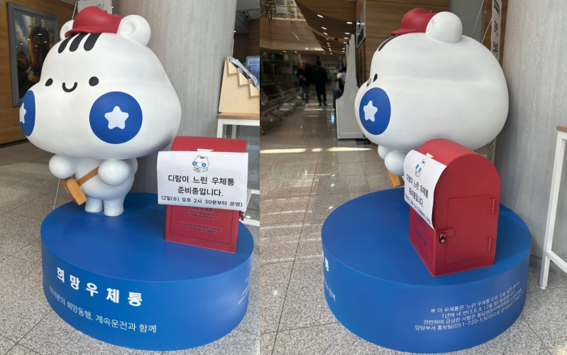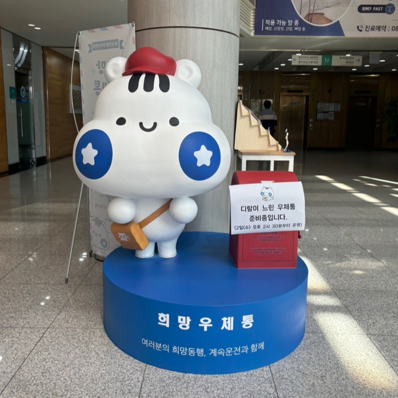 의학원에 방문하는 모든 사람들이 의학원 캐릭터 디람이를 형상화한 느린 우체통을 통해 희망 엽서를 보내 수 있게 되었습니다.