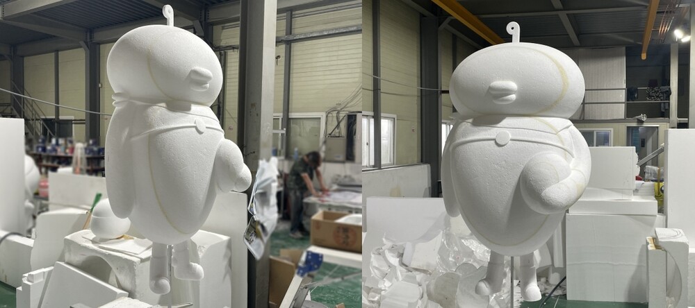 구스 조형물 제작을 위해 우선 원형 조각 작업을 진행해 주었습니다. 이번 포토존 조형물은 둥근 표현들이 많기 때문에 이러한 부분들을 정교하게 작업해 주기 위해 밀도가 높고 입자가 단단한 조각용 스티로폼을 사용해 원형 조각 작업을 진행해 주었습니다. 원형 조각을 조각용 스티로폼 이외에도 목재, 석고, 흙 등 캐릭터 조형물의 크기, 형태 등에 따라 다양한 소재로 제작이 가능합니다.