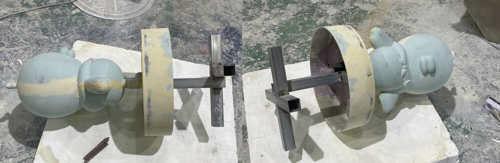 규산이 건조된 캐릭터 조형물은 몰드 제작에 들어가 주었습니다. 제작된 몰드 내부를 다듬고 FRP를 적층하여 성형체 제작을 진행해 주었습니다. 로이 조형물 내부에는 각 파이프를 삽입하여 조형물의 내구성을 높여주었습니다. 이후 미리 제작해 둔 하단 기단과 용접 작업을 통해 수직, 수평 등을 맞춰 결합 작업을 진행해 주었습니다.