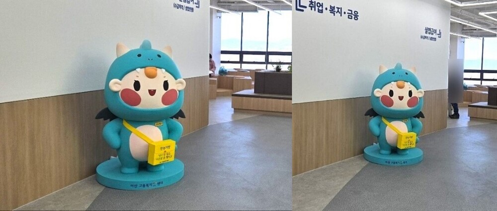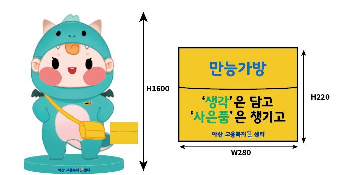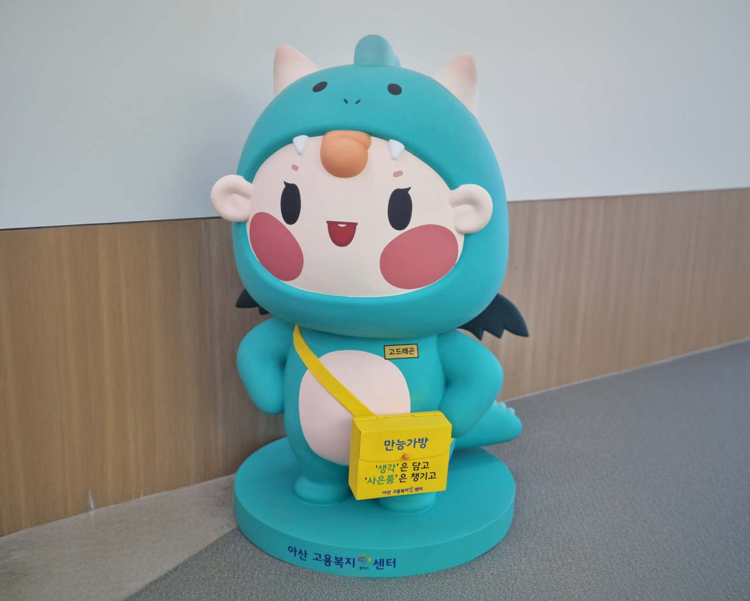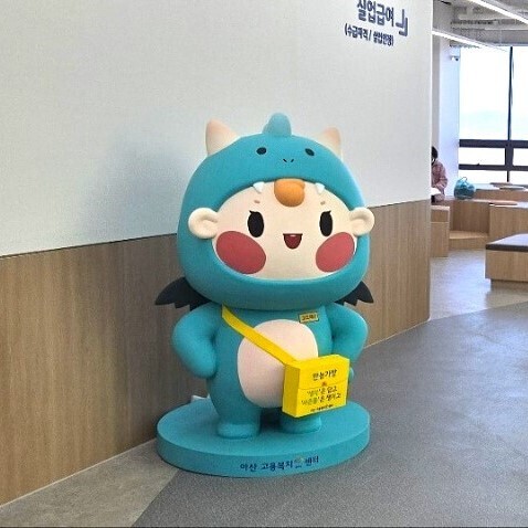 아산고용복지플러스센터에 설치된 캐릭터는 고용노동부 대표 캐릭터 고드래곤입니다.