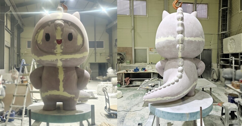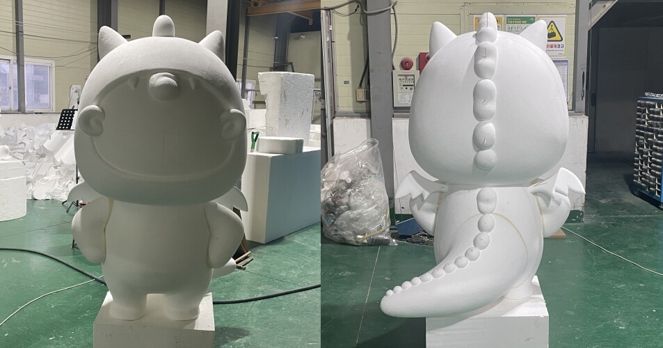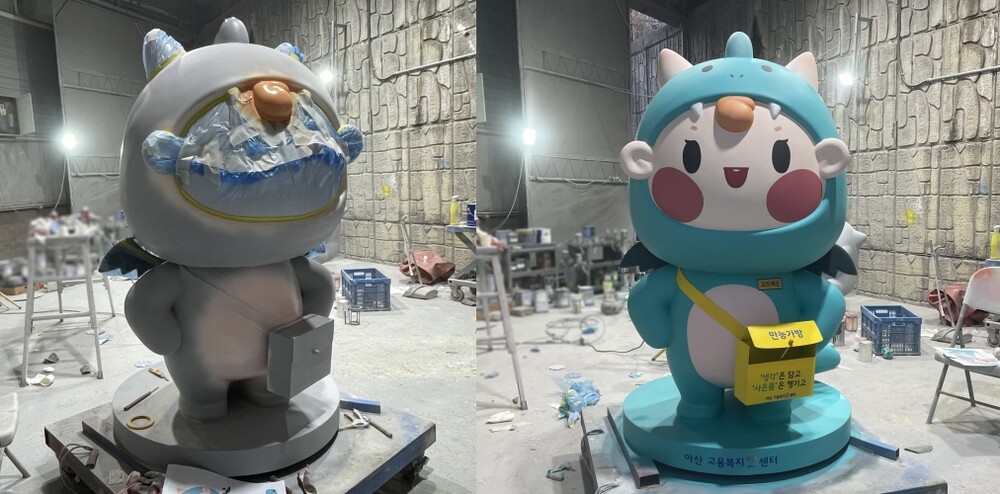 디자인 시안 작업이 완료되면 시안을 바탕으로 원형 조각을 진행해 주었습니다. 원형 조각을 밀도가 높고 입자가 단단한 조각용 스티로폼을 사용하여 캐릭터 FRP 조형물의 디테일한 부분들까지 섬세하게 표현해 주었습니다. 아산고용복지플러스센터 조형물의 원형 조각이 완료되면 클라이언트의 검수 과정을 거친 뒤 표면 전체에 규산을 도포해 주었습니다.