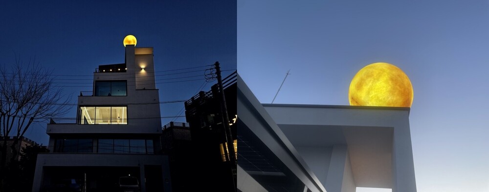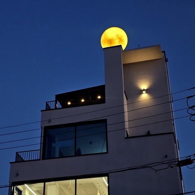 낮에는 기본 보름달 형태로 건물과 조화롭게 어우러지며 밤에는 내부에 조명이 커져 건물 위로 보름달이 떠오른 분위기를 연출합니다.