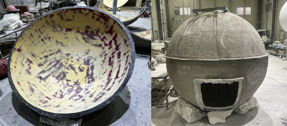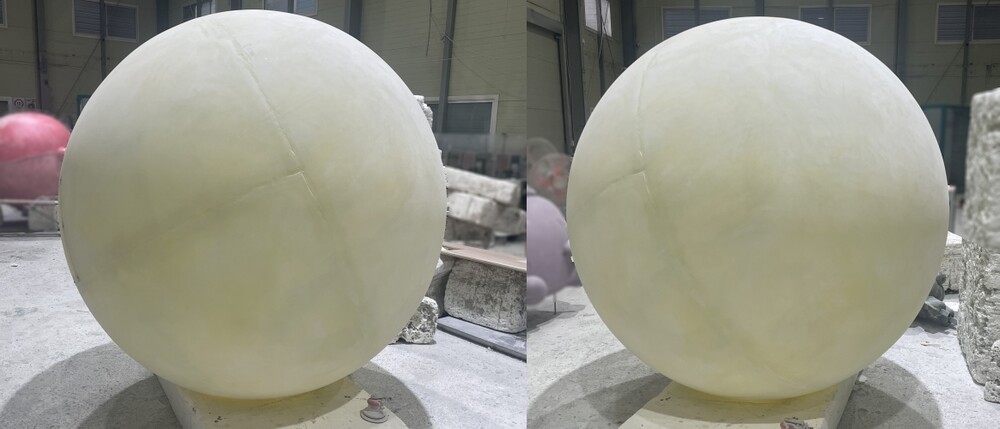 이번 건물 조형물은 크레이터가 없는 2M 크기로 요청해 주셔서 본사에서 보유 중인 몰드로 별도 원형 조각 단계 없이 몰드 내부 연마 작업을 진행해 주었습니다. 연마 작업 이후 왁스를 도포해 주고 반투명 수지를 적층 시켜 주었습니다. 반투명 수지는 일반적인 수지와 다르게 포토존 조형물 내부의 빛을 투과할 수 있어 내부에 보름달 조형물 들어가는 조형물에 많이 사용되고 있습니다.