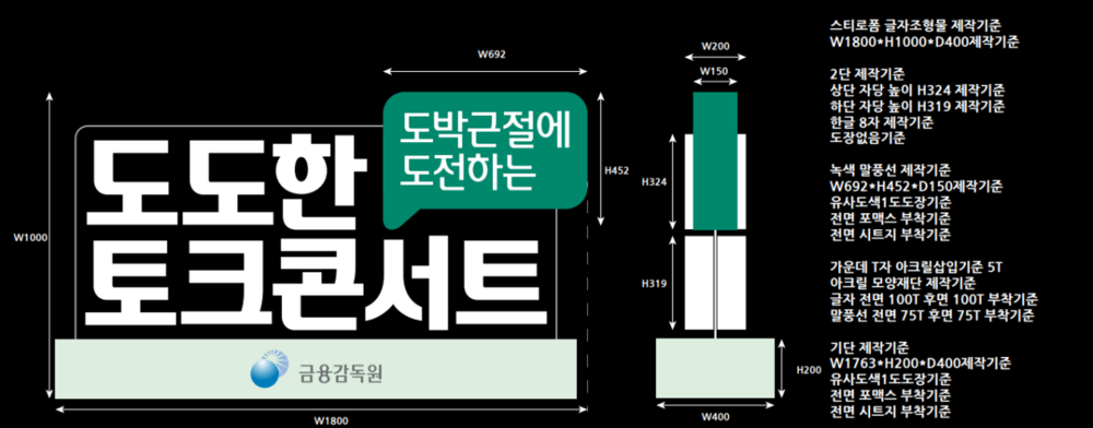 금융감독원이 주최한 도도한 토크콘서트 행사 무대에 맞춤으로 설치될 대형 스티로폼 조형물을 제작하였습니다. 행사명인 ‘도도한 토크콘서트’ 문구가 무대 공간에서 선명하게 드러날 수 있도록 글자의 크기, 형태, 간격을 세심하게 조정하여 디자인을 진행했습니다. 또한 제작 전 단계에서 구조적 안정성과 표현 가능 범위를 충분히 검토하여, 무대 연출에 적합하면서도 실제 제작이 가능한 디자인으로 구현되었습니다.