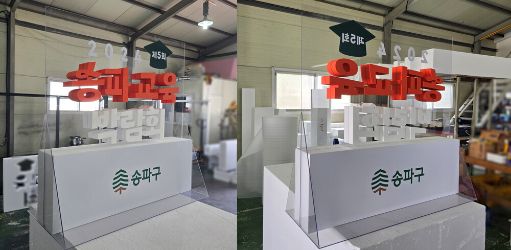 재단이 완료된 각 글자 조형물과 기단은 준비된 투명 아크릴판을 중심으로 앞면과 뒷면에 부착 작업을 진행하였습니다. 이번 스탠딩 글자 조형물은 무대 위 설치를 고려하여 내구성을 높이기 위해 옆면에 삼각발을 추가 제작하였습니다. 또한 송파구 로고와 2024, 제5회 등 행사 정보는 포맥스를 부착 후 실사 출력된 시트지를 덧붙여 완성도를 높여 제작하였습니다.