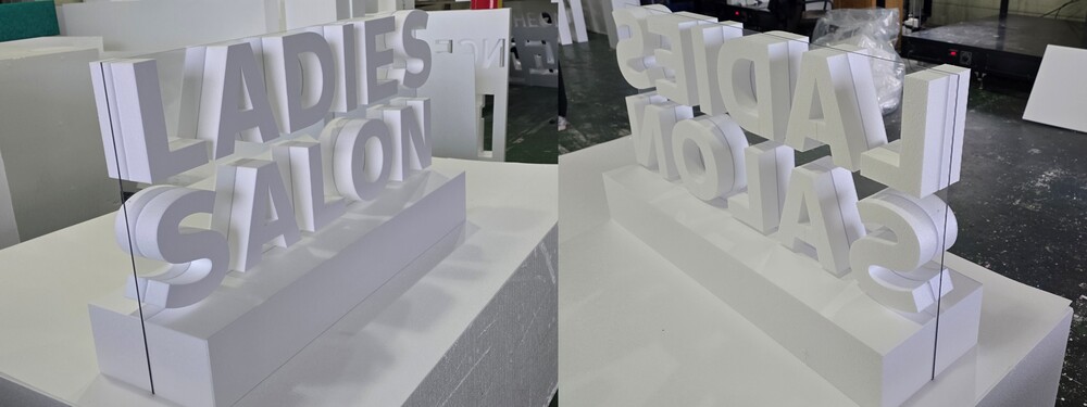 재단 작업 후 스티로폼 글자 조형물은 투명한 T자형 아크릴 판에 앞뒤로 정밀하게 부착됩니다. 또한 이번 조형물의 경우 표면에 포맥스가 부착되어 스티로폼 특유의 질감을 감추고 매끄럽고 깔끔한 마감 처리로 조형물이 제작되었습니다. 2단 구성된 디자인은 글자 조형물의 내구성, 안정성을 위해 중앙에 투명 PC판 즉 아크릴 지지대가 필수로 삽입되어야만 제작이 가능 합니다. 또한 필요에 따라 기단은 추가해 높이를 조절할 수 있습니다.