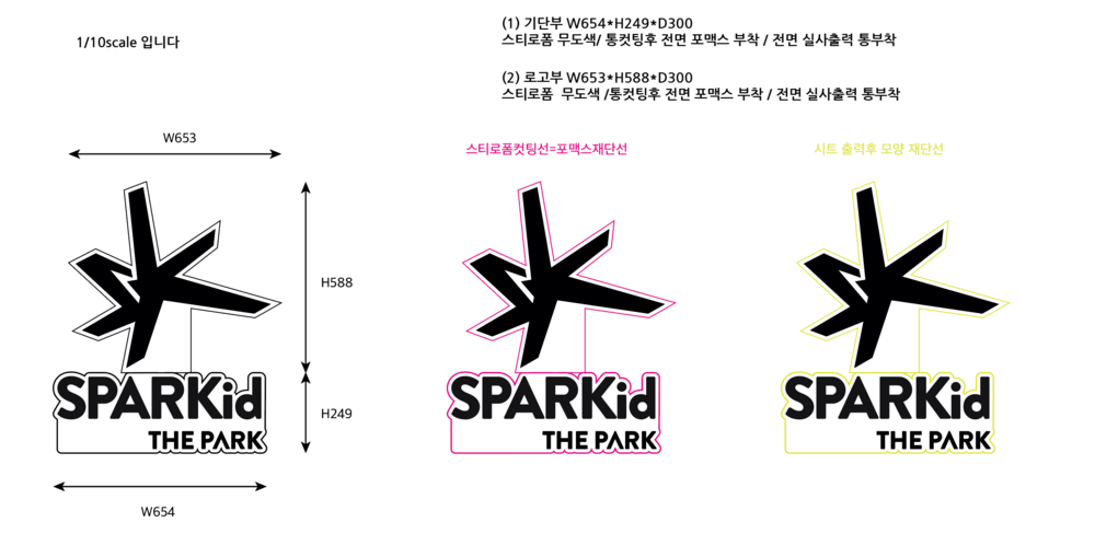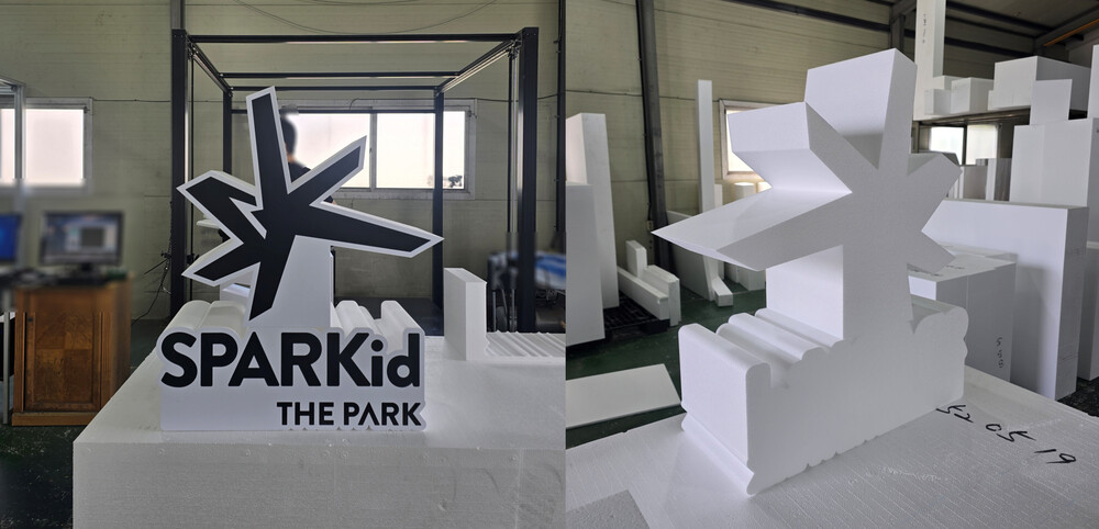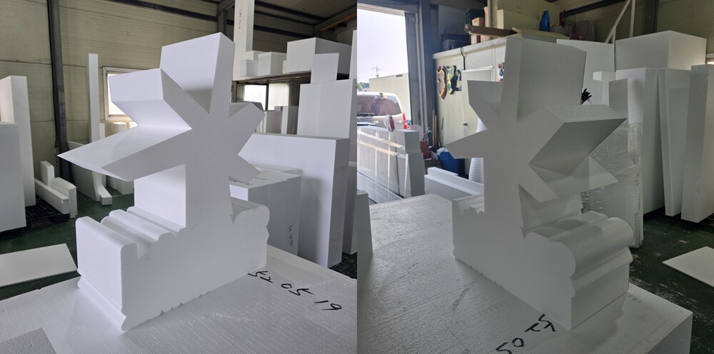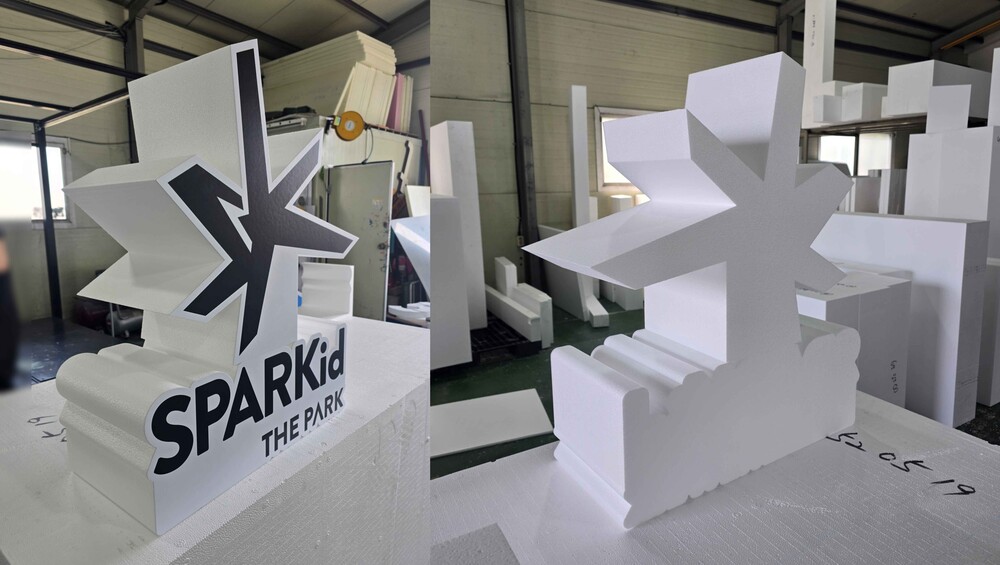 재단된 조형물 전면에는 포맥스를 부착한 후, 로고를 실사 출력한 시트지를 부착하는 방식으로 부착 작업이 진행되었습니다. 스티로폼 조형물의 경우 전면에 포맥스를 부착하여 표면을 매끄럽게 만든 뒤 시트지를 부착해야, 접착력과 마감 품질이 높아집니다. 포맥스 및 시트지 부착시에는 기포나 주름이 생기지 않도록 세심하게 작업하였으며, 완성 후에는 외관과 접착 상태를 꼼꼼히 점검하여 높은 완성도의 로고 조형물을 구현하였습니다.