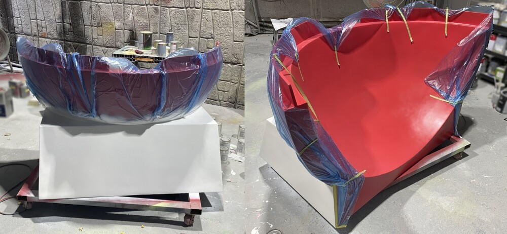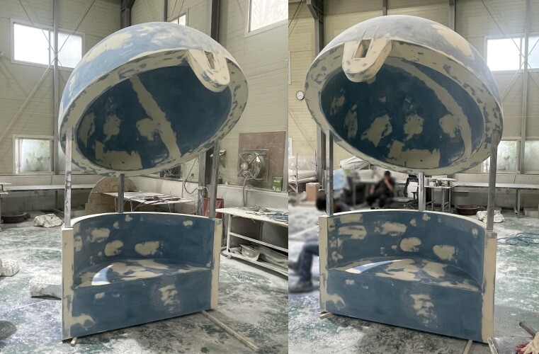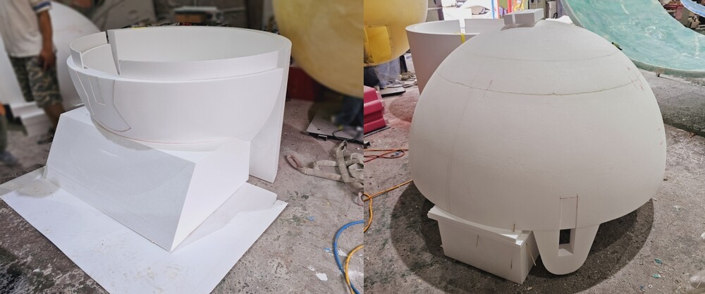 원형 조각이 완료된 조형물은 조형물 표면에 규산을 도포해 준 뒤 몰드 제작을 진행해 주었습니다. 제작된 몰드의 내부 표면을 정밀하게 다듬은 후, FRP 적층 작업을 통해 성형체를 제작해 주었습니다. 캡슐 조형물은 상단, 하단이 정확하게 결합이 되어야 하기 때문에 각 파이프를 추가해 주었습니다. 결합 작업이 완료된 대형 조형물은 도색 작업을 위해 프라이머를 도포해 주었습니다.