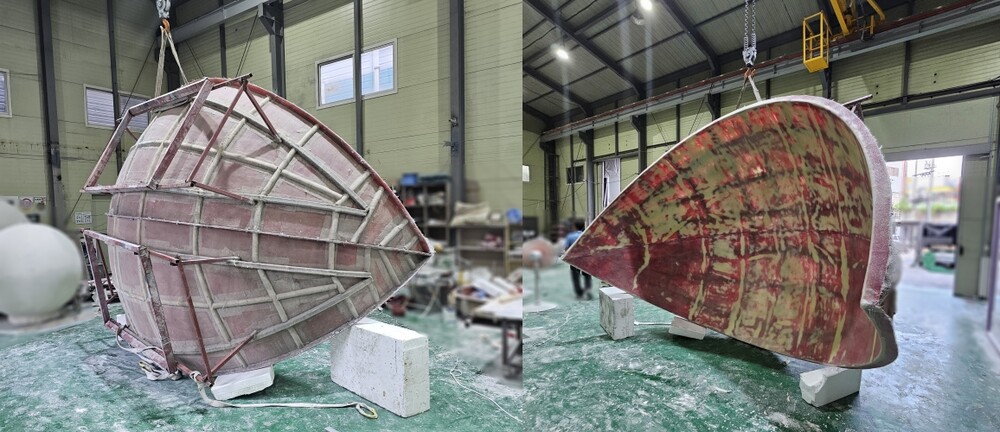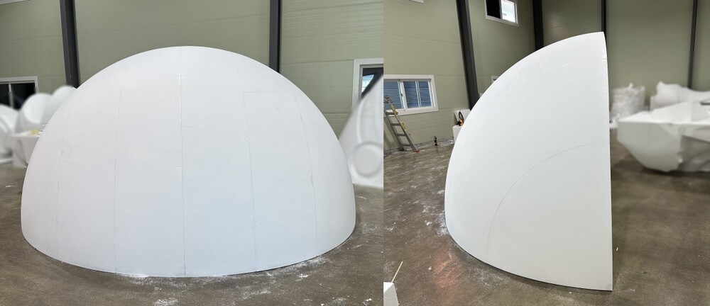 원형 조각이 완료된 건축 조형물은 규산을 발라주고 규산이 다 건조가 되면 몰드 제작을 진행해 주었습니다. 몰드는 설치 장소로 이동 및 추가 작업을 위해 8분할 하여 제작해 주었습니다. 제작된 몰드 내부를 다듬고 FRP를 적층하여 성형체 제작을 진행해 주었습니다. 성형체 적층 과정에서 제거되지 못한 기포와 요철 등으로 인해 조형물 내부 표면을 다소 거친데요. 이러한 부분들은 매끈한 표면이 될 수 있도록 연마 작업을 진행해 주었습니다.