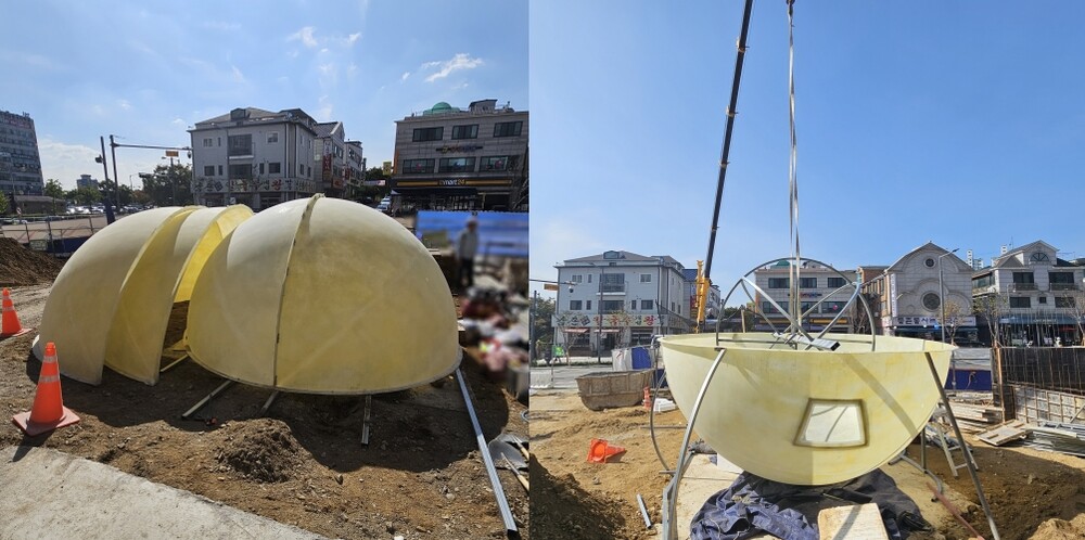 설치 장소로 이동된 실외 조형물은 도면에 맞게 결합 작업을 진행해 주었습니다. 결합 작업 시에는 크레인을 이용하여 조형물의 수직, 수평이 틀어지지 않도록 꼼꼼하게 작업을 진행해 주었습니다. 조형물 내부에는 각 파이프를 추가하여 분할 제작된 조형물울 안전하게 고정시켜 주었습니다. 결합 작업이 마무리된 조형물은 이음매 부분을 퍼티로 메워주고 연마 작업을 진행해 주었습니다.