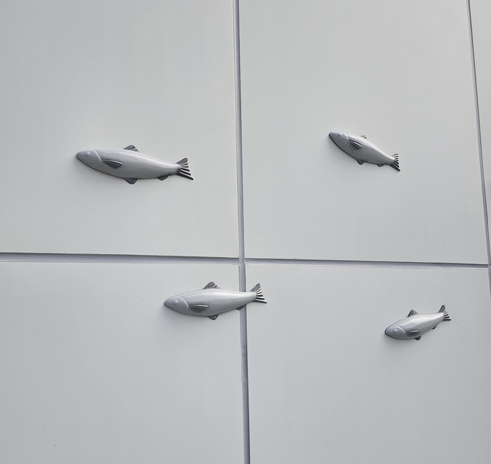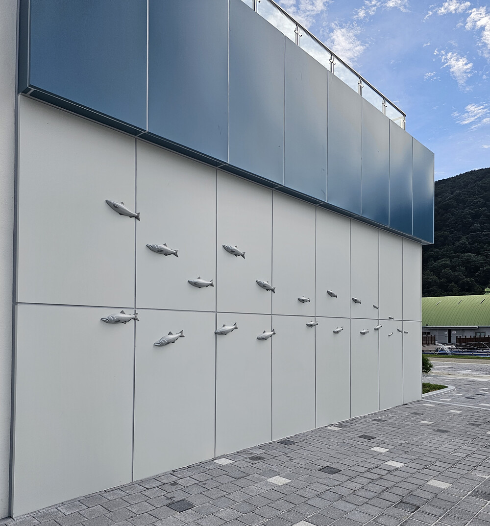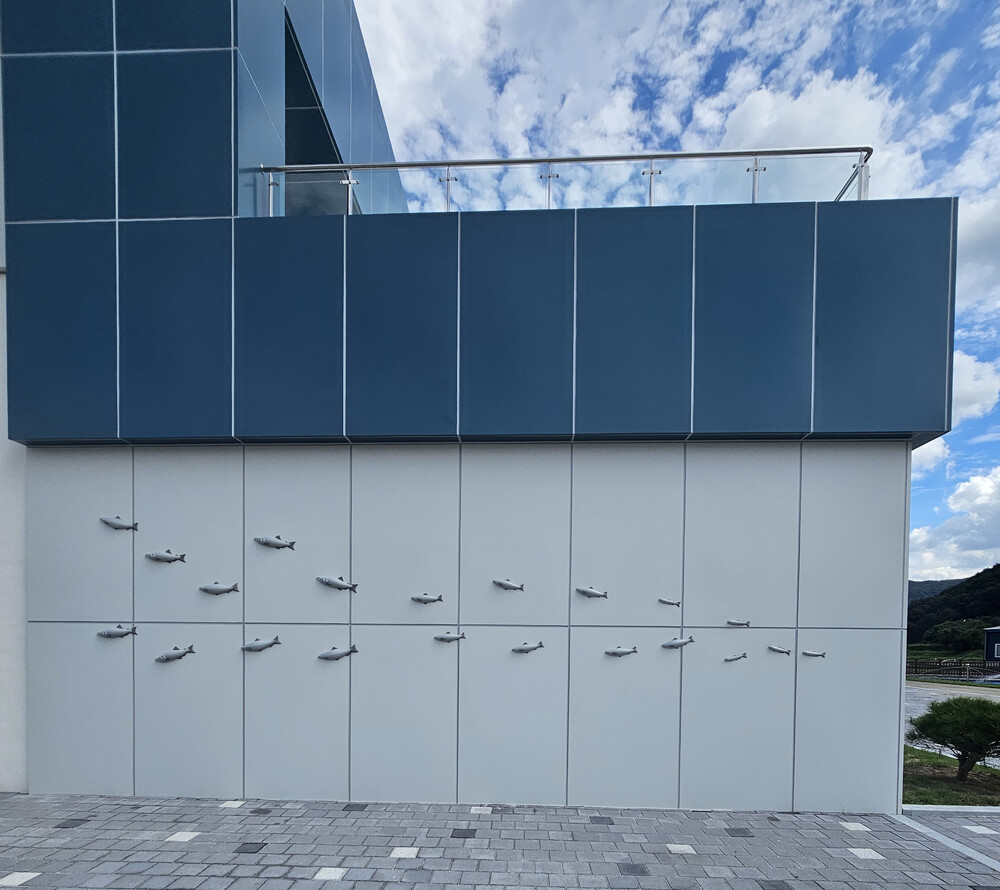 밀양 민물고기 센터 외벽 부조형 연어 물고기 포토존 조형물