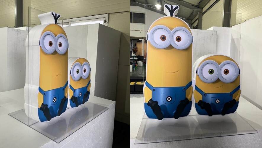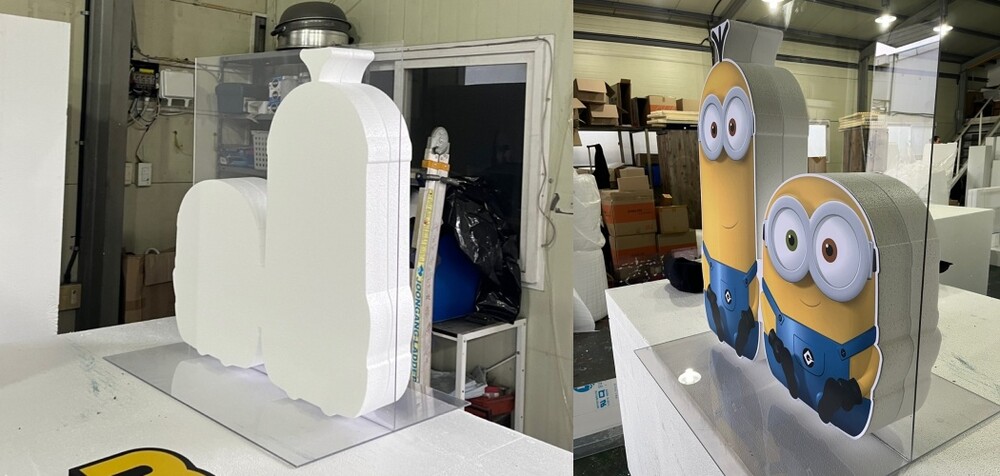 미니언즈 조형물은 제작 기간이 촉박하고, 진행 행사 무대 위에 설치될 예정이라 스티로폼 소재를 사용해 주었습니다. 스티로폼은 다른 소재에 비해 저렴하며 빠르게 제작이 가능한 소재이며, 입자가 작고, 밀도가 높아 조형물 제작이 많이 쓰이는 소재 중 하나입니다. 디자인 시안 작업이 완료된 조형물은 정확한 사이즈로 2개씩 제작하기 위해 컴퓨터 조각기를 사용하여 진행해 주었습니다.