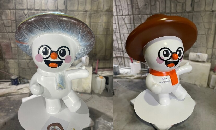 평창 지자체 마스코트 눈동이의 원형이 완성되면 표면을 규산 처리하여 몰드 작업에 적합하게 준비한 뒤, FRP를 여러 겹 쌓아 성형을 진행했습니다. 조형물 뒷면에는 점검구를 마련하고 내부에 각파이프를 삽입해 안정성을 확보했습니다. 분할된 조각은 디자인과 동일하게 맞춰 조립하고, 연결부와 점검구 주변을 매끄럽게 마감하여 자연스러운 외형을 완성했습니다.