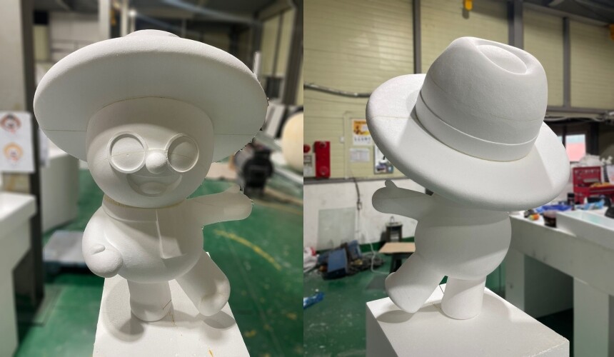 눈동이 조형물은 실제 제작에 들어가기 전, 스티로폼을 활용해 원형을 만드는 과정부터 시작합니다. 전체적인 윤곽은 기계로 절단하여 잡아내고, 세부 표현은 조각가가 직접 손으로 정교하게 다듬어 완성도를 높입니다. 대형 조형물은 작업의 정밀도를 위해 여러 부분으로 나누어 수작업으로 조각한 뒤, 다시 하나로 이어붙이는 방식으로 진행됩니다. 이번 작업 또 숙련된 조각 전문가가 직접 원형을 완성했고, 이후 클라이언트 검수 과정을 거쳐 본 제작에 들어갔습니다.