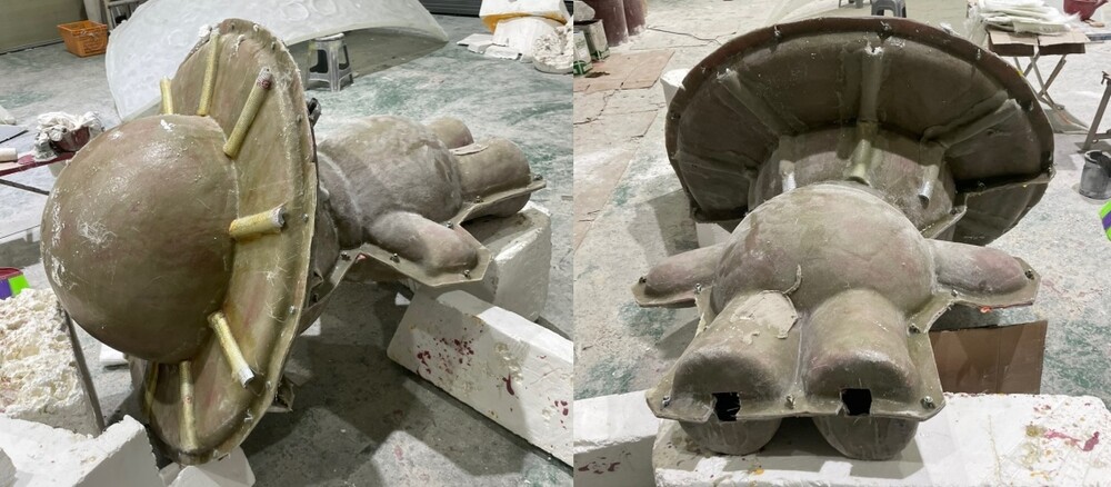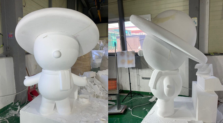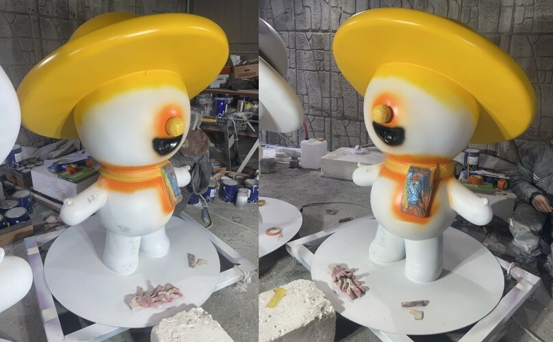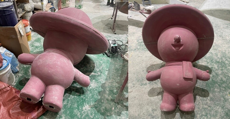 원형 조각이 완료되면 규산을 발라 몰드 제작을 준비해줍니다. 캐릭터 조형물의 후면에 점검구를 제작하여 내부에 각파이프를 추가하여 조형물의 내구성을 높주었습니다. 조형물에 사용되는 몰드는 크게 다회용 몰드와 일회용 몰드로 나누어집니다. 다회용 몰드는 동일한 형태, 크기의 조형물을 제작할때 추천을 드리고있습니다. 초기의 몰드 비용이 발생하지만 이후 조금 저렴해지며 빠르게 FRP 조형물 제작이 가능합니다.