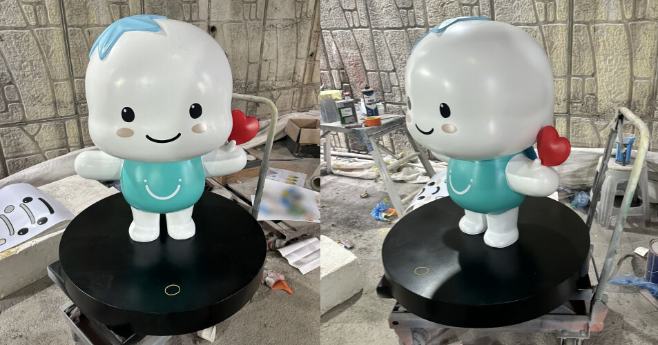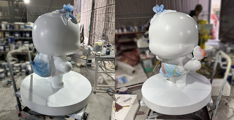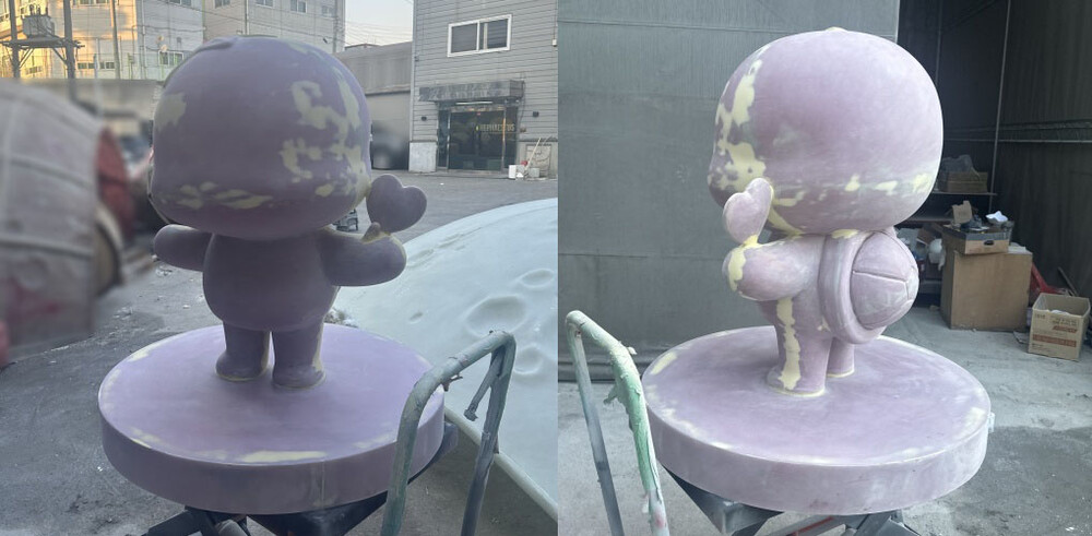 연마 작업 및 결합 작업이 완료된 조형물은 프라이머를 도포해 주었습니다. 프라이머가 완전히 건조가 되면 사전에 클라이언트와 논의된 색상으로 도색 작업을 진행해 주었습니다. 조형물의 눈, 입, 하트 등의 디테일한 부분들을 깔끔하게 표현해 주기 위해 시트지와 마스킹 작업을 해주었습니다. 도색 작업이 완료된 조형물은 클리어를 도포해 마무리해 주었습니다.