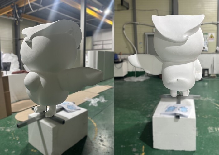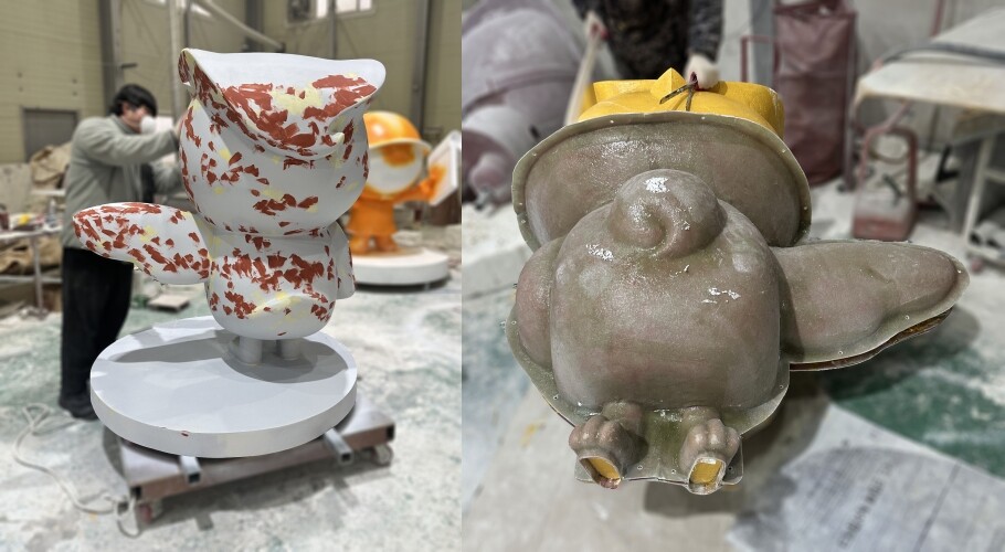 이번에 제작된 금융감독원 마스코트 ‘똑부리’ 조형물은 FRP 소재의 대형 입체 형태로 완성되었습니다. 기본 골격은 조각용 스티로폼으로 형태를 다듬은 뒤, 캐릭터의 세부 요소가 정확히 표현되었는지 확인하며 조각 작업을 진행했습니다. 조각이 마무리되면 몰드 제작 단계에 들어가며, 이 과정에서 규산을 표면에 도포해 화학 반응으로 인한 원형 파손을 방지하고 전체적인 완성도를 높였습니다.