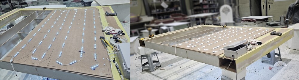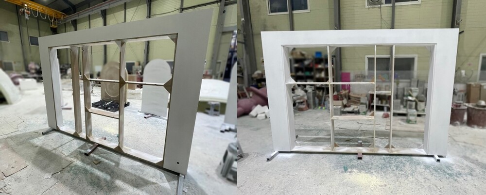 연마 작업이 마무리된 팝업스토어 조형물은 사전에 논의된 색상으로 도색 작업을 진행해 주었습니다. 이번 진열대 조형물에 사용된 도료는 방염처리가 된 수성 방염 도료를 사용해 주었습니다. 도색 작업이 진행될 때 조형물의 내부에 LED 배선에 맞춰 조명 작업을 진행해 주었습니다.