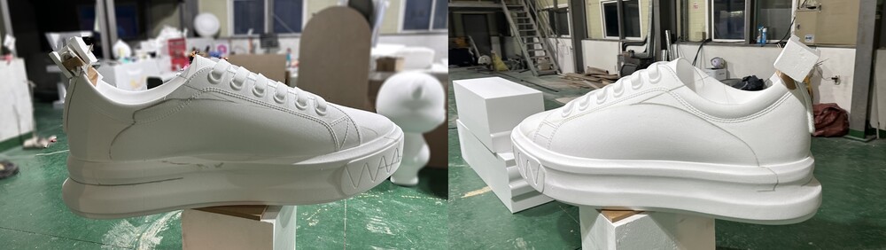 제작 과정에서 발생하는 요철과 기포들은 다소 거친 표면을 띄고 있습니다. 이러한 부분들은 퍼티로 구멍을 메꿔주고, 사포나 샌딩기 등을 사용하여 매끄러운 표면으로 만들어주었습니다. 신발 조형물의 스티치나 홈 등의 디테일한 부분들은 사포로 하나하나 수작업으로 진행해 주었습니다. 연마 작업이 완료된 조형물은 프라이머를 도포하여 다음 작업을 준비해 주었습니다.