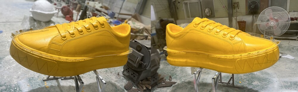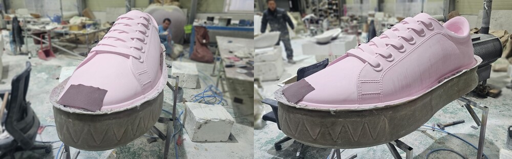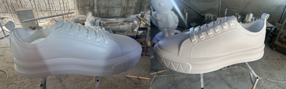 전시장 내 퍼포먼스가 진행될 예정이랑 내구성과 내식성이 좋고, 형태 표현력이 좋은 FRP 소재로 추천드렸습니다. 실내 조형물의 소재는 사용 목적, 설치 장소, 사용 기간 등에 따라 다양한 소재로 제작이 가능합니다. 신발 조형물 같은 경우 스티치, 끈 등의 디테일한 부분들은 3D 컴퓨터 조각기를 사용하여 제작을 해주었습니다. 원형 조각이 마무리되면 규산을 발라 대형 조형물의 몰드 작업을 준비해 주었습니다.