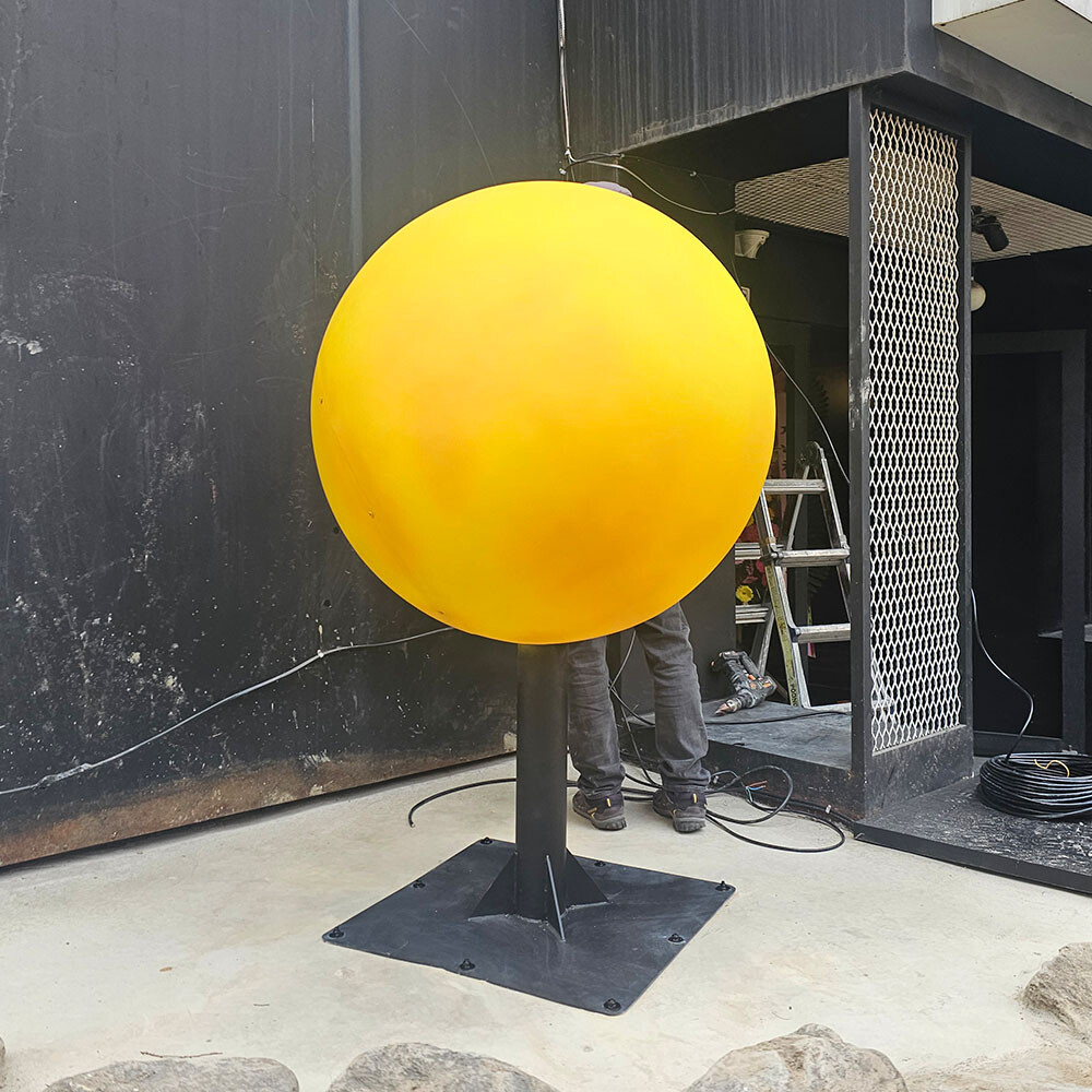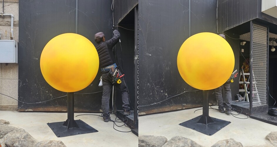 이렇게 설치 작업까지 마무리된 조형물은 클라언트의 최종 검수를 마치며 건물 야외 입구 FRP 조명형 보름달 포토존 조형물 프로젝트를 마무리해 주었습니다.