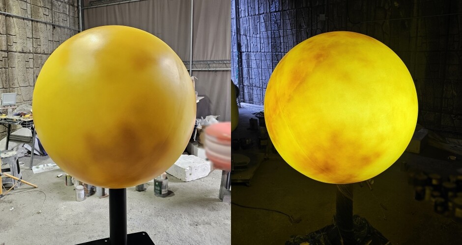 조명형 조형물 같은 경우 빛이 안에서 밖으로 빛이 고르게 퍼져야 하기 때문에 투명 도료와 일반 도료를 섞어 양을 조절한 뒤 작업을 해주었습니다. 얇게 여러 번 레이어링 하여 도료가 흐르거나 뭉치지 않도록 꼼꼼하게 진행해 주었습니다. 하단 기둥은 보름달 조형물에 눈이 더 갈 수 있도록 최대한 어두운 색상으로 진행을 해드렸습니다. 도색 작업이 완료되면 조형물에 클리어를 도포하여 제작을 마무리해 주었습니다.