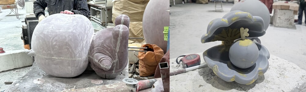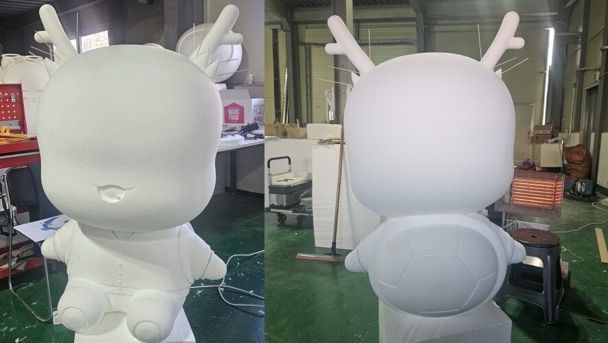 먼저 디자인 시안 작업을 진행해 주면서 예산, 사용 목적, 설치 장소 등을 논의하여 알맞은 소재와 제작 방식을 추천드렸습니다. 기룡이 조형물의 경우 둥근 표현이 많아 일반적으로 사용되는 스티로폼 소재가 아닌 입자가 단단한 조각용 스티로폼을 사용해 원형 조각을 진행해 주었습니다. 조형물 특성상 내부가 비어있고 단단하기 때문에 제작 이후에는 수정이 불가능합니다. 원형 조각을 토대로 조형물의 형태가 결정되기 때문에 원형 조각 단계에서 디자인 시안과 동일하게 제작이 될 수 있도록 신경 써서 진행해 주었습니다.
