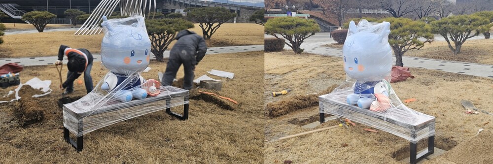 제작이 마무리된 마스코트 조형물은 꼼꼼하게 포장한 뒤 운송 작업을 진행해 주었습니다. 야외 잔디밭에 설치되어 사람들이 앉아 있을수 있도록 흔들리지 않게 기초 공사를 진행해 드렸습니다. 지정 위치에 더파기를 진행해준 뒤 기초석을 추가하여 앙카 볼트를 이용해 조형물과 벤치는 볼팅고정을 통해 고정해 안정적이게 설치될 수 있도록 해주었습니다. 설치가 완료된 FRP 조형물은 되메우기 후 잔디를 덮어 마감해 주었습니다.