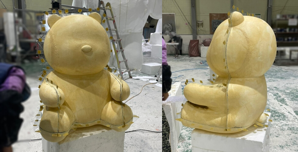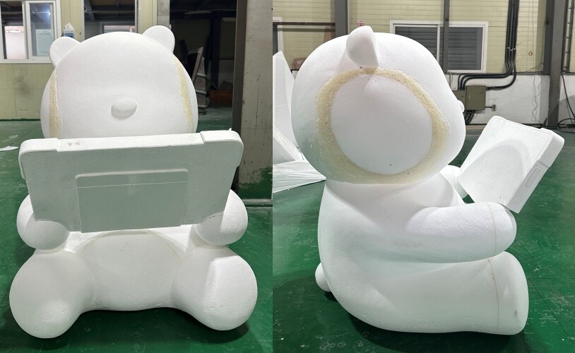 듬이 조형물 제작을 하기 위해서는 먼저 원형 조각을 진행해 줍니다. 실외 조형물 같은경우 장기간 설치가 되어야하고 조형물이 벤치위에 설치가 될 예정이라 사람들이게 많은 노출이 될 수 밖에 없어서 내구성과 내식성이 좋은 FRP 소재로 추천을 드려 진해하였습니다. 일반 스티로폼이 아닌 형태 표현력이 우수한 조각용 스티로폼을 사용하여 원형 조각을 진행해 주었습니다.