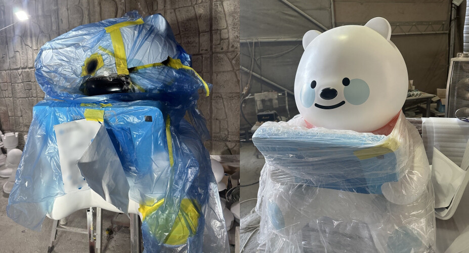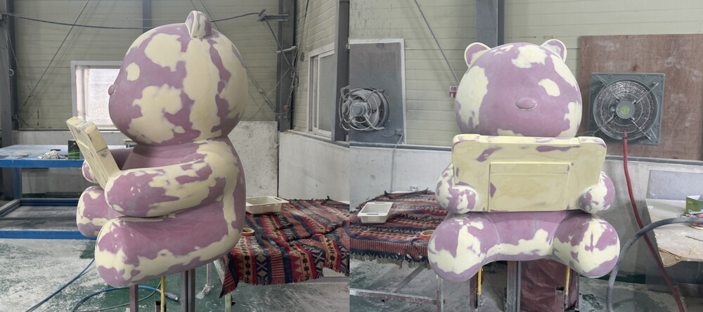 밀크T 캐릭터 조형물 원형 조각이 완료되면 규산을 도포하여 다음 작업인 몰드 작업을 준비해 주었습니다. 캐릭터의 원형 조각 중간에는 필름지를 부착하여 몰드와 원활한 분리가 가능하도록 작업해주었습니다. 듬이 조형물의 규산이 완전히 건조가 되면 조형물 몰드 제작을 진행해 줍니다. 제작된 몰드의 내부는 매끈하게 다듬어서 FRP를 적층하여 동물 캐릭터 조형물 성형체 제작을 진행해 주었습니다.