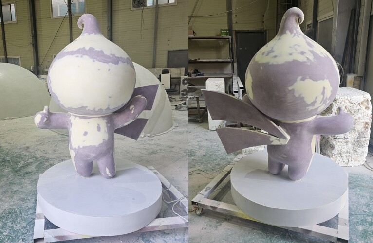 원형 조각이 마무리된 홍보 조형물은 규산을 발라주고 다 건조가 되면 몰드 제작을 진행해 주었습니다. 몰드 내부 연마 작업 이후 FRP를 적층하여 성형체 제작을 진행해 줍니다. 조형물 내부에는 각 파이프를 합침하여 방울이 조형물의 내구성을 더욱 높여주었으며, 하단 FRP 기단과 결합하여 단단하게 고정을 시켜주었습니다. 결합 작업이 완료된 조형물은 프라이머를 도포해 주었습니다.
