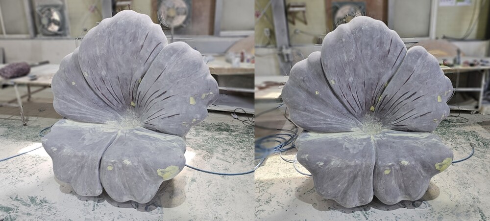 원형 조각이 완성된 대형 조형물은 규산을 도포해 준 뒤 건조가 되면 몰드 제작을 진행해 주었습니다. FRP 조형물의 꽃술 부분과 꽃잎 부분들의 디테일한 표현들은 잘 살려주기 위해 분할하여 몰드 제작을 진행해 주었습니다. 제작된 몰드 내부를 다듬고 성형체 적층을 진행해 주었습니다. 분할하여 제작한 부분들은 디자인 시안과 동일한 위치로 결합 작업을 진행해 주었습니다.