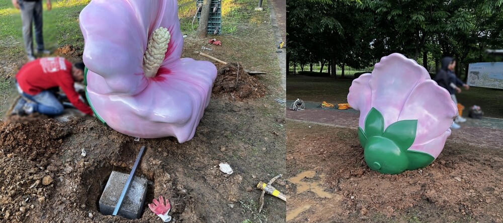 제작이 완료된 조형물은 꼼꼼하게 보양을 한 뒤 사전에 클라이언트와 논의된 설치 장소로 운송을 진행해 주었습니다. 광주 무궁화동산에 도착한 조형물은 흙 위에 설치될 예정이라 기초 공사를 진행해 주었습니다. 땅을 조금 파주고 조형물 밑에 미리 부착해 둔 금속 화스너와 기초석을 각 파이프로 연결 후 용적 작업을 통해 단단하게 고정해 주며 설치를 마무리해 주었습니다.
