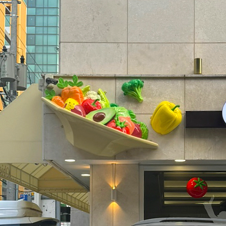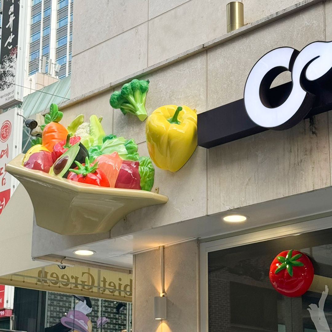 실제 샐러드의 모양과 유사하게 제작이 되어 밋밋한 벽면에 입체적이 요소가 더해지면서 사람들의 눈길을 끌 수 있으며