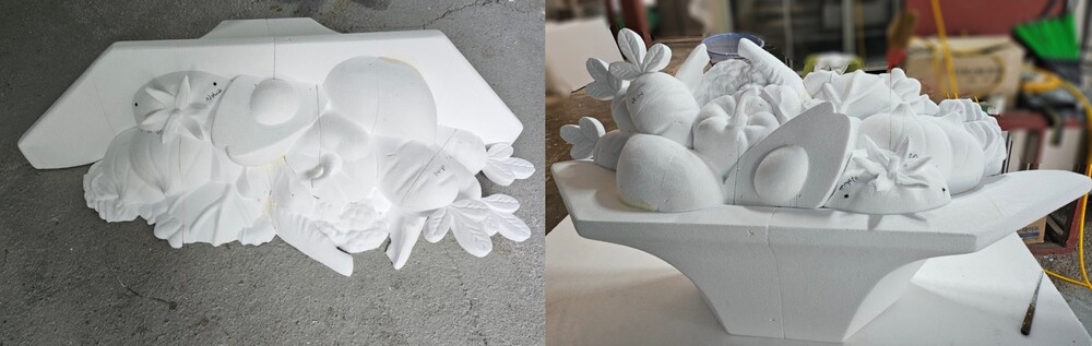 디자인 시안 작업이 완료되면 이제 간판 조형물 제작 과정 첫 번째 단계인 원형 조각을 진행해 주었습니다. FRP 조형물의 형태는 원형 조각 단계에서 결정이 되기 때문에 입자가 단단한 조각용 스티로폼을 사용해 최대한 꼼꼼하게 작업을 진행해 주었습니다. 원형 조각에 사용되는 소재는 조각용 스티로폼뿐만 아니라 부조 조형물의 크기, 형태 등에 따라 석고, 목재, 흙 등의 다양한 소재로 제작이 가능합니다.