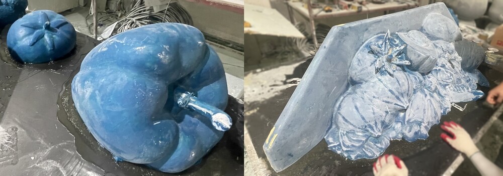 원형 조각이 마무리된 샐러드 조형물은 몰드 제작으로 넘어가 주었습니다. 몰드를 제작해 주고 내부 표면을 다듬은 뒤 성형체 적층을 진행해 주었습니다. 성형체 적층 과정에서 제거되지 못한 요철과 크랙 등으로 인해 조형물 내부 표면은 다소 거칠기 때문에 이러한 부분들은 퍼티, 사포 등을 이용하여 매끄러운 표면으로 연마 작업을 진행해 주었습니다.