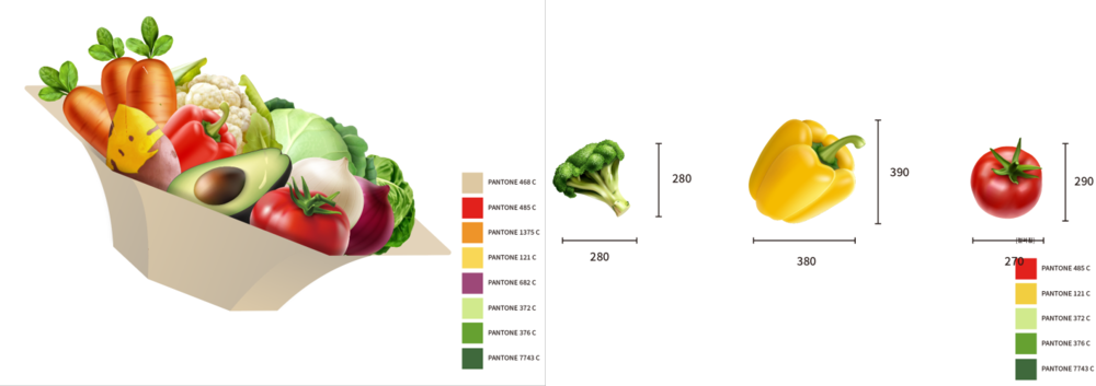 디자인 시안을 먼저 작업해 주었습니다. 이번 매장 조형물의 경우 디자인 시안은 클라이언트께서 전달해 주셔서 저희는 간단한 작업을 도와드렸습니다. 샐러드 조형물은 실제 과일, 야채 모양과 최대한 유사해야 하기 때문에 색상 표현 또한 아주 중요한데요. 조형물의 색상은 팬톤 컬러칩을 사용하여 지정해 주었습니다.