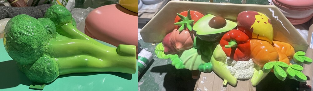 연마 작업이 완료된 샐러드 조형물은 프라이머를 도포해 준 뒤 프라이머가 완전히 건조가 되면 도색 작업을 진행해 주었습니다. 색상은 사전에 클라이언트와 논의된 색상으로 도색을 진행해 주었으며, 프로콜리, 당근, 고구마 등 디테일한 부분들은 시트지와 마스킹 작업을 통해 깔끔하게 표현해 주었습니다.
