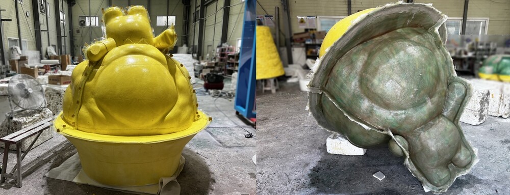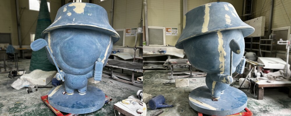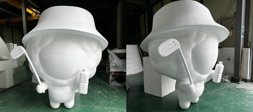 규산은 몰드 제작 과정에서 원형 조각이 파손되거나 형태 변형을 박아주는 역할을 하고 있습니다. 쏭이 캐릭터 조형물에 도포한 규산이 완전히 건조가 되면 몰드 제작을 진행해 주었습니다. FRP 입체 조형물의 물병, 골프채 등의 디테일한 부분들은 분할하여 깔끔하게 제작해 주었습니다.