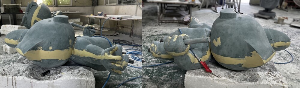규산이 건조가 되면 몰드 제작을 진행해 주었습니다. 몰드 내부 표면을 다듬은 뒤 FRP를 적층하여 성형체 제작을 진행해 주었습니다. 캐릭터 조형물은 그 자체만으로도 강도가 높지만 FRP 조형물 내부에 각 파이프를 삽입하여 조형물의 내구성을 더욱더 높여주었습니다. 꾸리 조형물 하단 다리 쪽에 파이프를 노출시킨 뒤 하단 FRP 기단과 용접 작업을 통해 단단하게 결합 작업을 진행해 주었습니다.