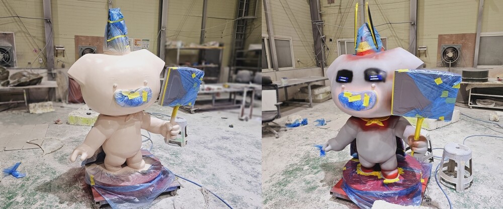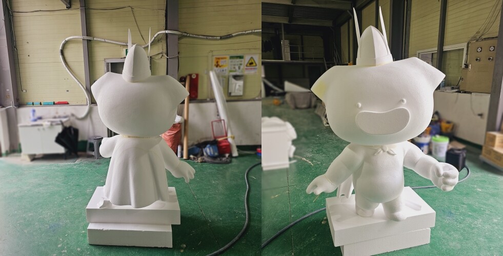 결정된 디자인 시안을 바탕으로 야외 조형물의 원형 조각을 진행해 주었습니다. 행사 조형물은 원형 조각을 바탕으로 FRP 조형물의 형태가 결정되기 때문에 사전에 꾸리 조형물이 어떻게 만들어지는지 확인이 가능합니다. 꾸리의 모자, 코, 망토 등은 깔끔하게 제작을 하기 위해 분할하여 제작을 진행해 주었습니다. 원형 조각이 완료되고 클라이언트의 사진 검수가 완료되면 다음 작업을 위해 규산을 도포해 주었습니다.